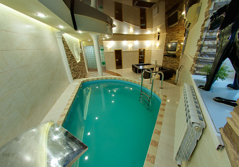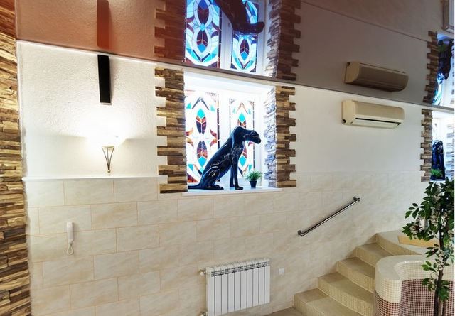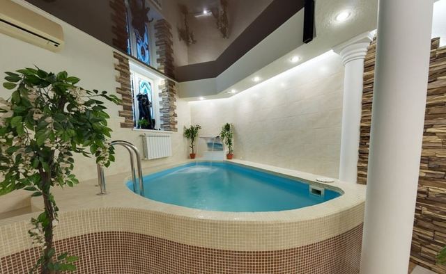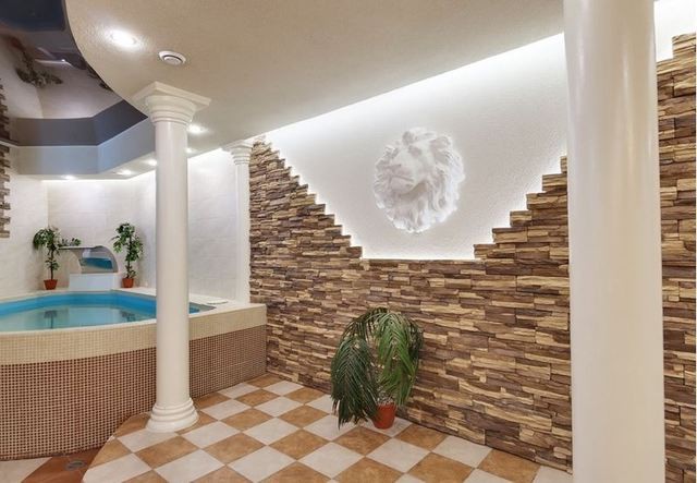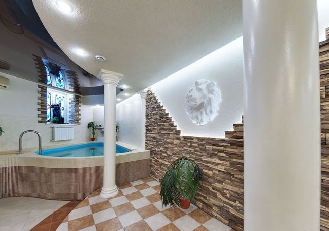 В сауне есть два зала. Первый рассчитан на большую компанию. Здесь просторная гостевая с неординарным интерьером: подиум с колоннами, витражи на окнах, скульптуры животных, бассейн размером 3Х3 с подсветкой, водопадом и искусственной волной.