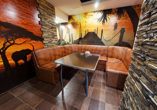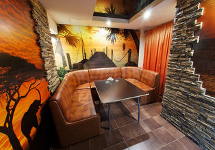 Второй зал подойдёт для более узкого круга друзей. Оформление зала окунёт вас в атмосферу экзотики. На стенах красуются изображения жаркой Африки с красивыми закатами, потрясающими пейзажами и фауной. Для посиделок с семьей и друзьями есть обеденная зона со столом и мягкими диванами. Попариться можно в финской сауне, после чего освежиться в бассейне или душевой, а потом вздремнуть в комнате отдыха. Для полного релакса можно понежится в массажном кресле.